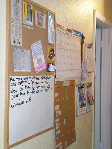 Depending on the complexity of your creativity skills or budget, you can also add decorative measures, such as ribbons, bows or picture frames of each family member, but feel free to be as basic as possible. After gathering the materials, you will want to choose a location for the family command center. This area should be centralized and should be a place that is often visited so that the command center is utilized. Examples of areas could be the kitchen, hallway or dining room.